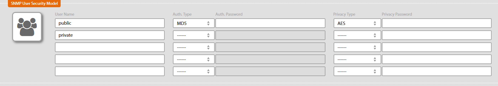 SNMP Version 3 web interface differs in security setting. Instead of SNMP Community List there is chart with SNMP User Security Model setting.