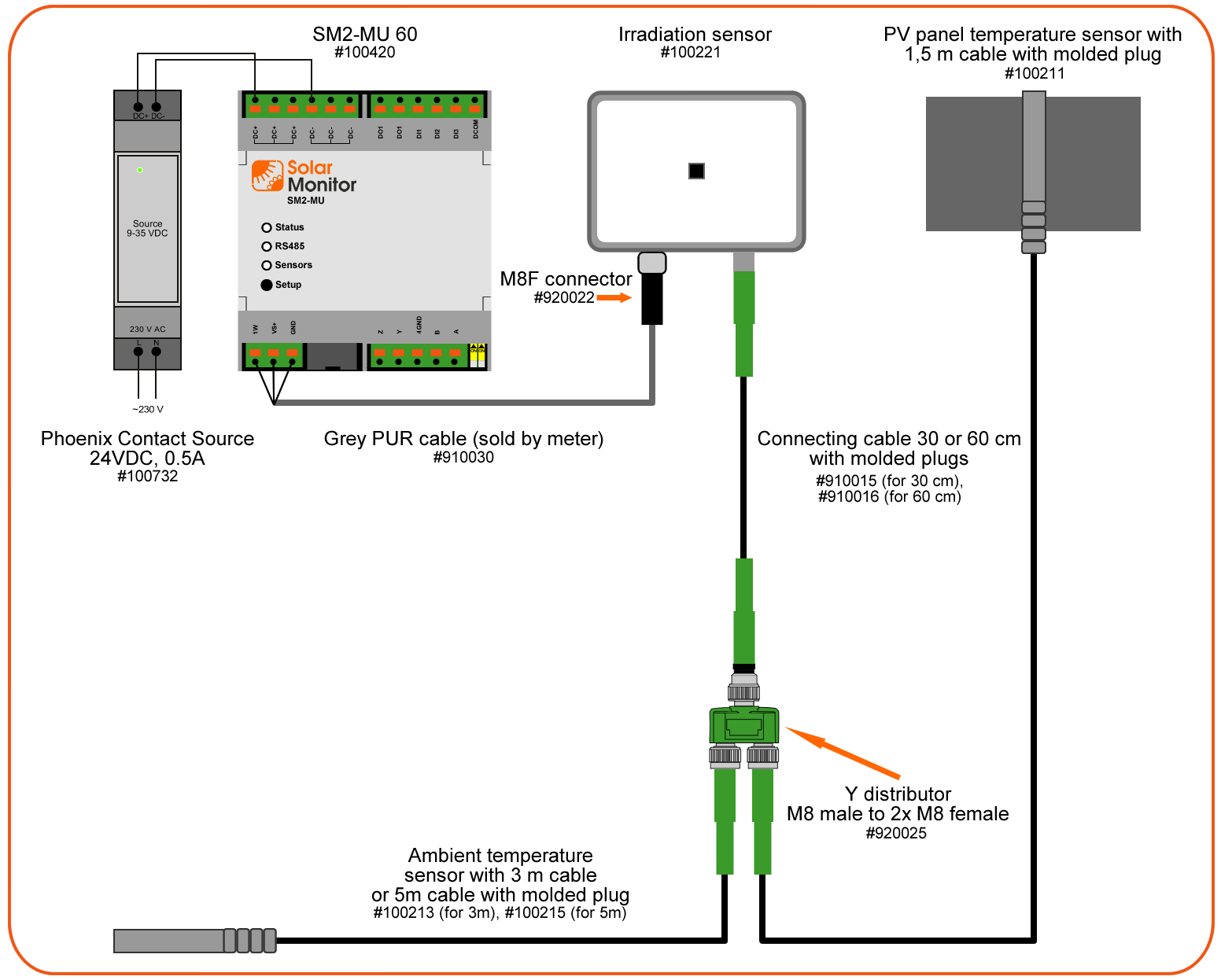 The irradiance sensor is connected to the Solar Monitor using an outdoor PUR cable (length as required) with an M8F connector.