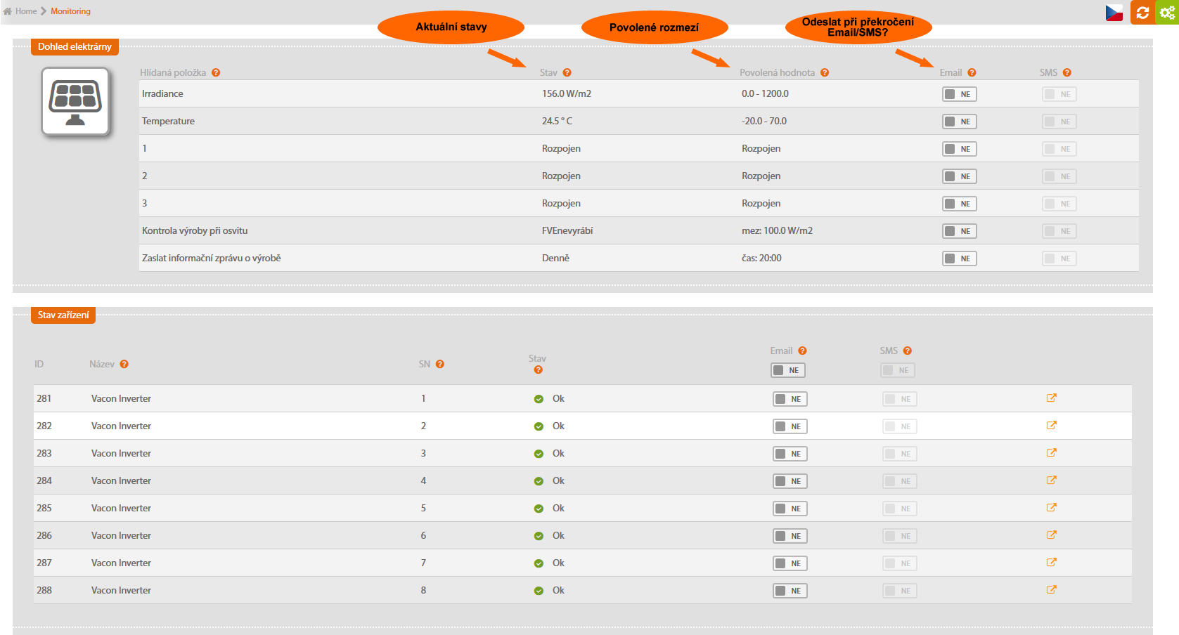 Pokud je na zařízení (střídači apod.) zjištěna porucha (sloupec „stav“), je okamžitě odesláno zvolené upozornění uživateli.