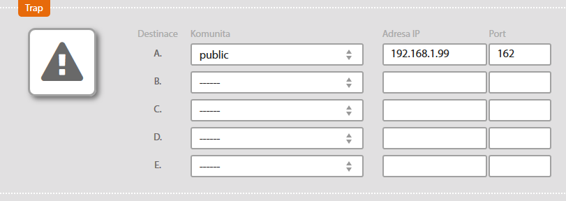 Ze seznamu komunit vybereme komunitu, která nám povoluje přístup na vzdálené zařízení. Nastavíme jeho IP adresu a port. Pro trapy se standardně používá port 162.