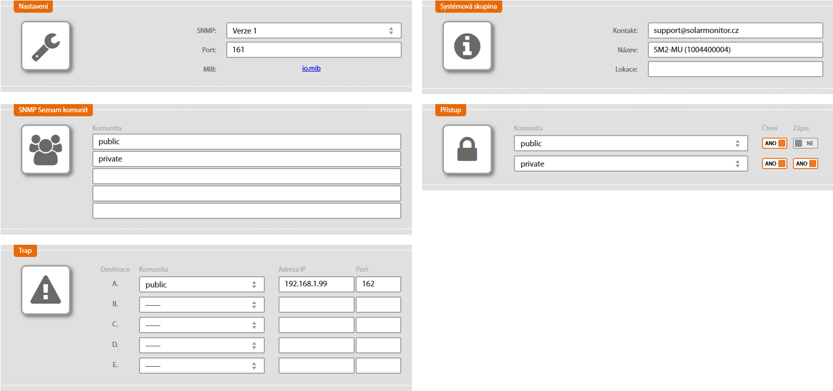 Nastavení SNMP přístupu k zařízení.