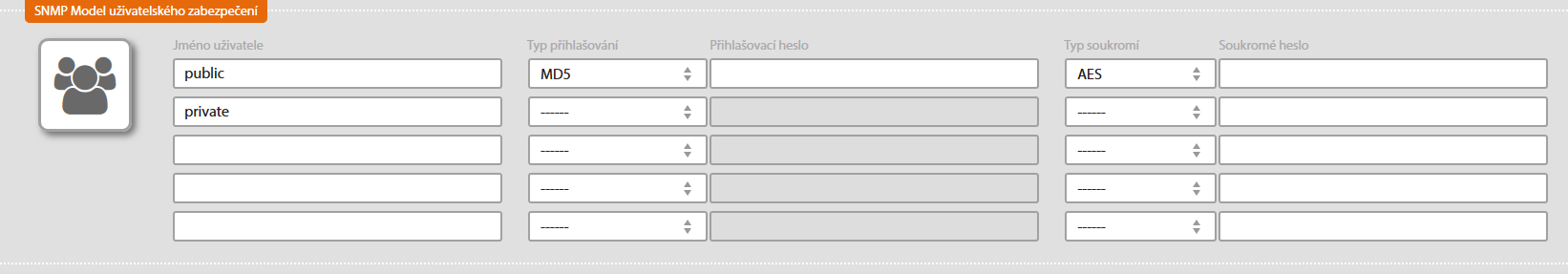 Pro SNMP Verze 3 se webové rozhraní liší v nastavení zabezpečení. Namísto nastavení SNMP Seznam komunit se zobrazí tabulka s nastavením SNMP Model uživatelského zabezpečení.