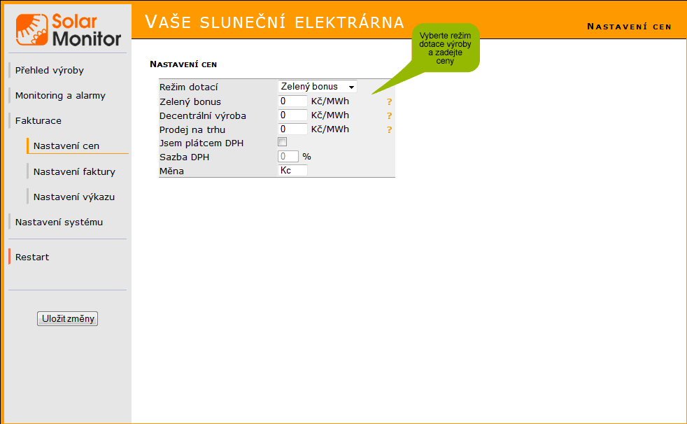 V menu Nastavení cen je třeba zadat aktuální ceny, platné pro současný rok. Tyto ceny slouží pro orientační výpočet výnosů (zobrazeny v menu Přehled výroby) a pro fakturaci. Pokud byste potřebovali fakturovat za určité období s jinou sazbou za kWh, je možno tyto hodnoty upravit a po vystavení faktury opět vrátit zpět.