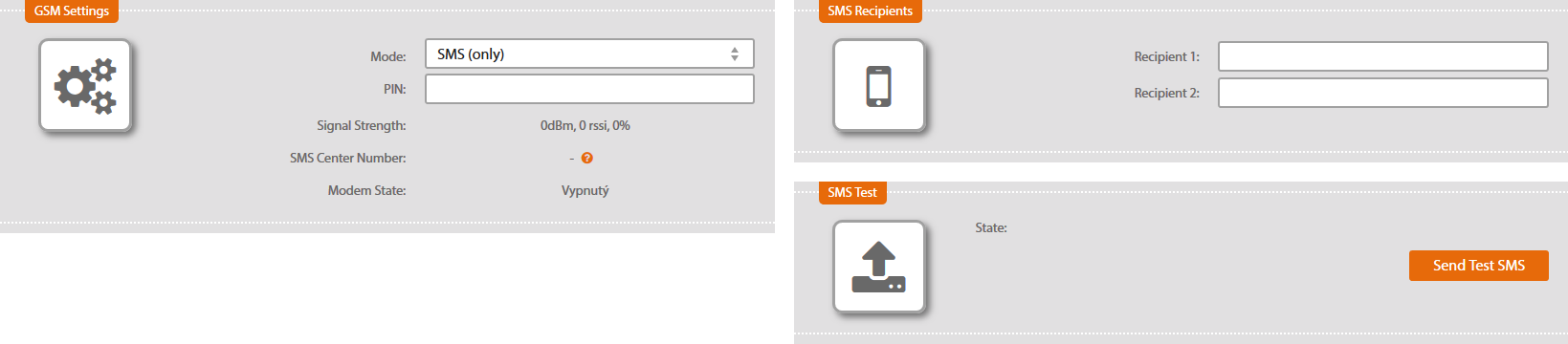 Enter recipient's phone number (maximum two recipients) in the following format: +420xxxxxxxxx. You can test the setting and functionality by using a „Send Test SMS“ option.