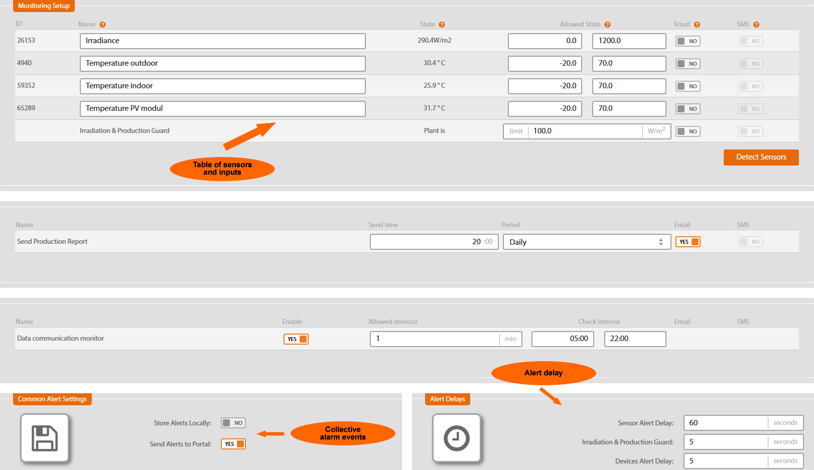 In case of detected device (e.g. inverter, tracker) connection failure it sends alarm to the portal.