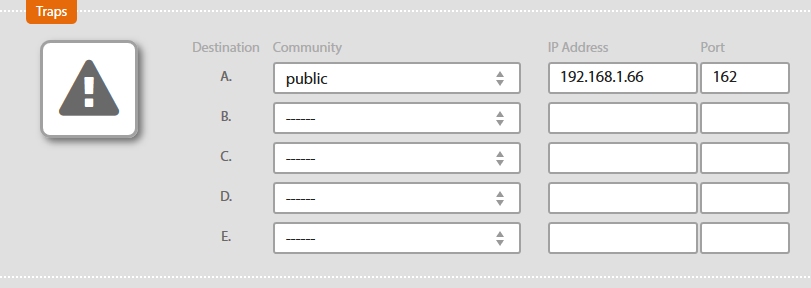 <font 14px/Arial, sans-serif;;rgb(51, 51, 51) font-family: Arial, sans-serif; font-size: 14px;;;#ffffff>Select community, fill in IP Address with IP address of PC with iReasoning MIB Browser, port 162 at trap server side.</font>