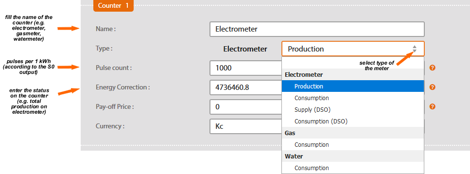 Find out how many pulses per kWh does your electrometer generate at SO output. This information is available at the label or in its documentation. Enter this number into the box Pulses Count in SM2-MU.