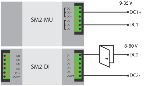 For the second type of wiring, where inputs of SM2-DI module use external power supply (see the following picture), voltage has to be in the range of 8-80 V.