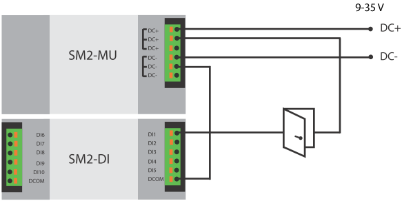 The first one requires connecting terminal DC- to SM2-MU with relevant terminal DCOM at the module SM2-DI. One terminal DCOM goes with inputs DI1–DI5 and the second terminal with inputs DI6–DI10. In order to start the input, signal DC+ from SM2-MU unit has to be connected to relevant terminal of SM2-DI terminal.