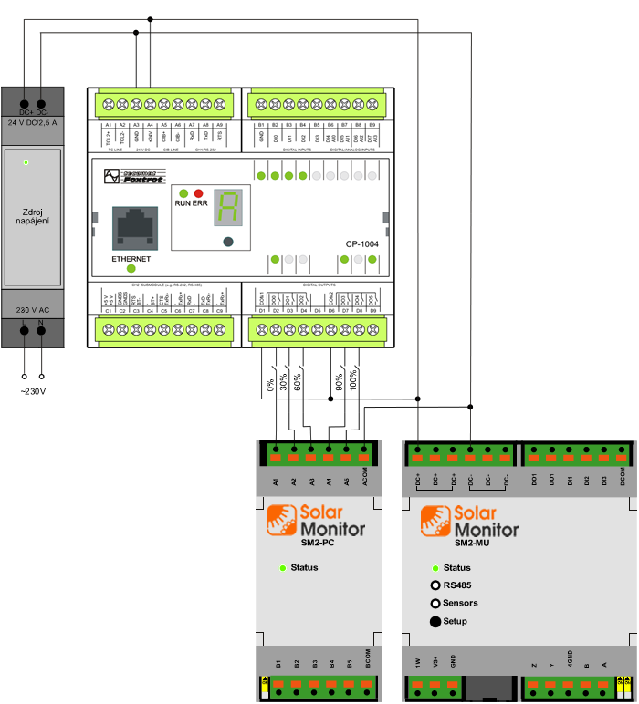 As soon as the modules are connected and Solar Monitor unit is connected to the power supply, a green LED diode indicating status should glow. In case it doesn't glow, check if module is connected to SM2-MU. Open menu „System set up / Power control“ in you browser. You have to set up inputs combinations and relevant power control values in % or cos φ here.