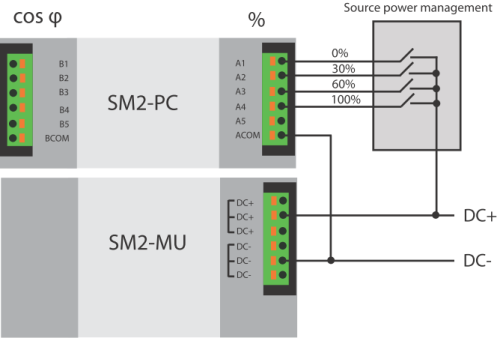 Signal DC- has to be connected to ACOM and BCOM terminals in order to control the power. Signal DC+ has to be connected to the multiple terminal of power control source (net operator's device). Power control signals are connected to terminals A1-A5 to control active power in % and to terminals B1-B5 to control reactive power (cos φ). The following picture shows sample scheme of active power control wiring in 0 - 30 - 60 - 100%.