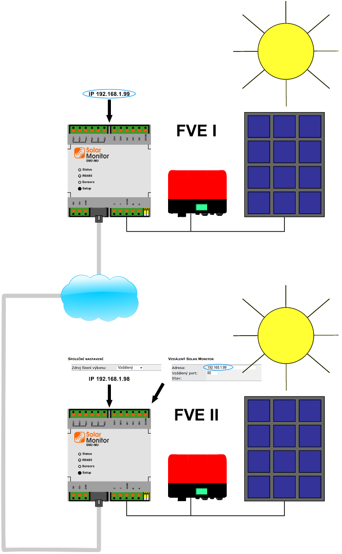 If you wish to use PC module for more Solar Monitor units, select option „Remote“ in menu „Power control source“ for each unit. Fill in the address of SM2-MU, where the power control module is connected. .