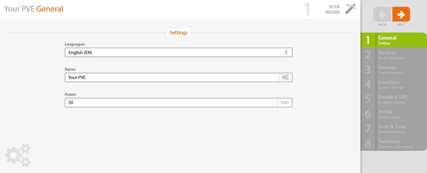 First step: select language, enter PV plant's name and installed output. Click on Next on the right to get to the second step.