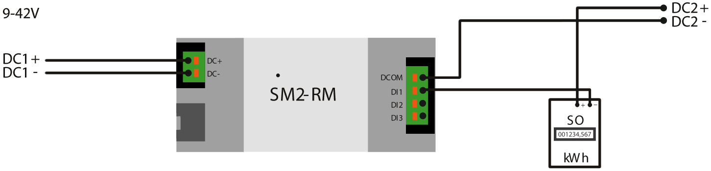 Connect SM2-RM to the meter with its S0 (pulse) output as shown in the following picture: Connecting in case both SM2-RM and meter each has its power supply: