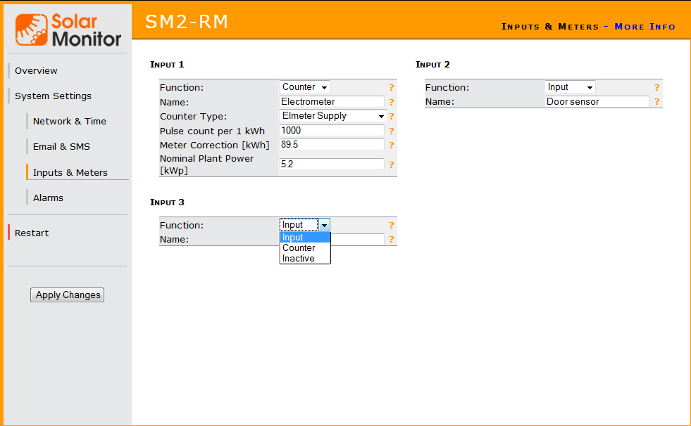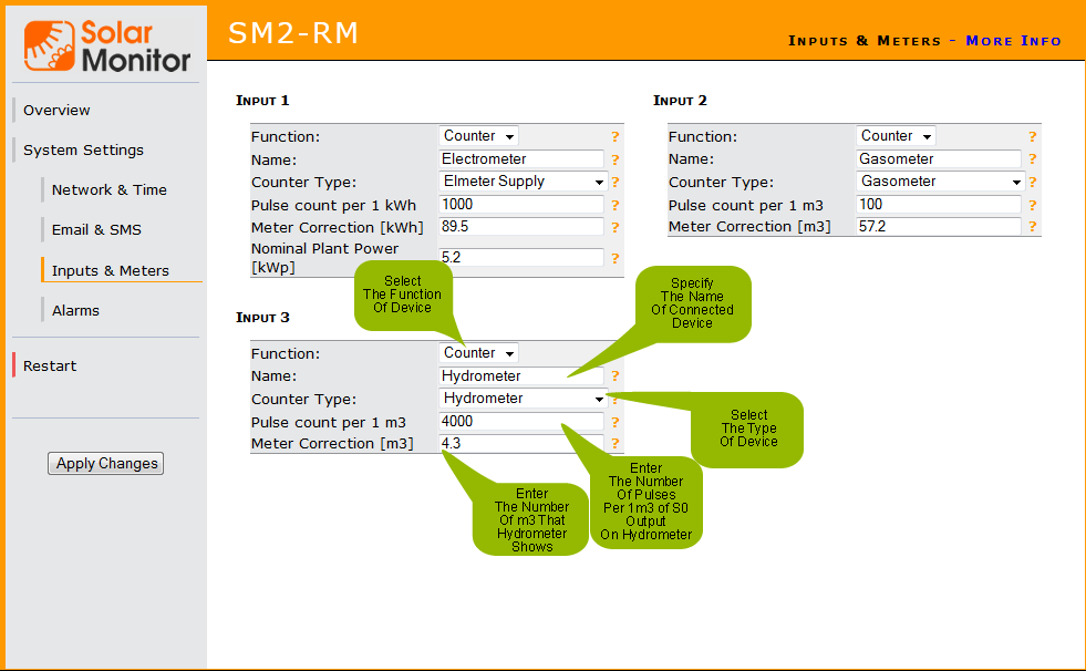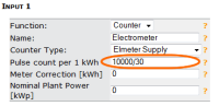 Fill in the number of pulses per a unit (kWh, m³), that your meter generates at the SO output. This information is stated at the meter's label or in its documentation. If wrong number of pulses is entered, SM2-RM will show wrong production or consumption values.