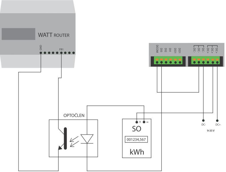 K elektroměru se připojí pomocí S0 (pulzního) výstupu dle následujícího obrázku: