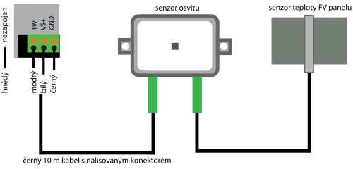 K Solar Monitoru lze připojit až 10 senzorů. Celková délka vedení nesmí přesáhnout 100 metrů. Lze připojit následující senzory s popsanými kabely. V případě zapojení více senzorů zapojte jednotlivé kabely paralelně do stejných svorek.