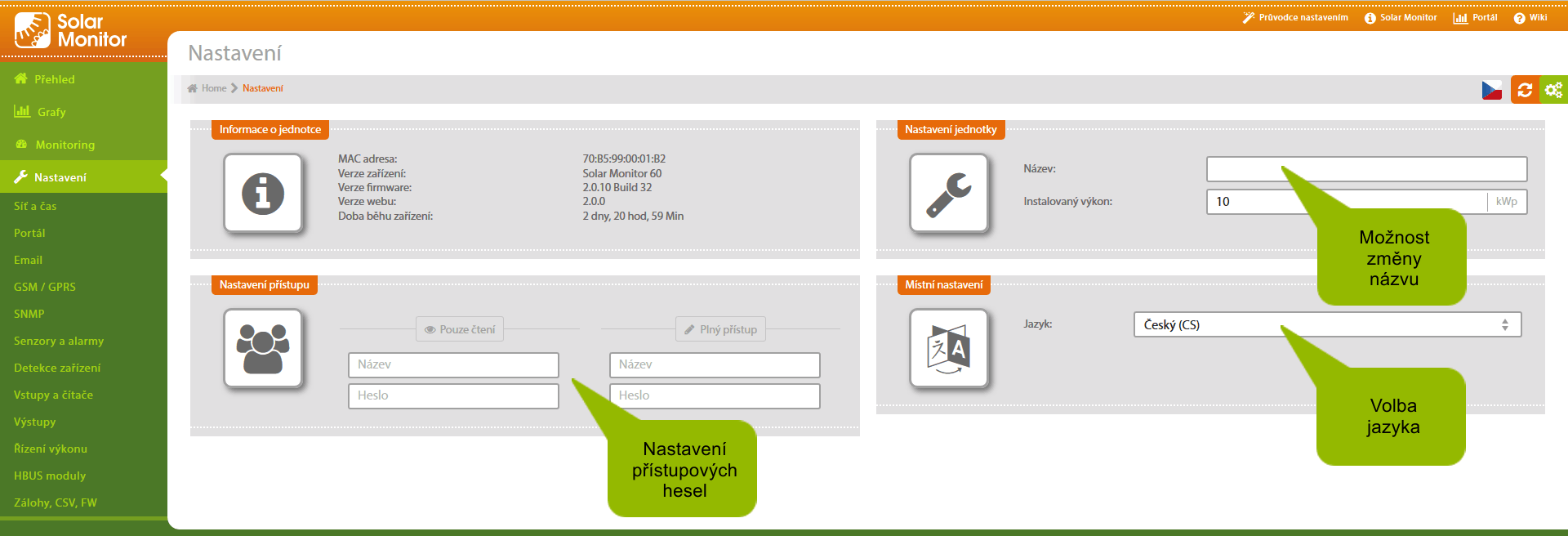 Nastavte uživatelské jméno a heslo pro plný přístup. Uživatel který se přihlásí s těmito údaji má neomezené možnosti při práci s jednotkou Solar Monitor.