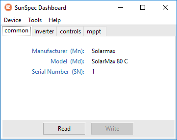 Modbus komunikaci je poté možné zobrazit v aplikaci SunSpec Dashboard (více informací a podmínky pro instalaci najdete zde).