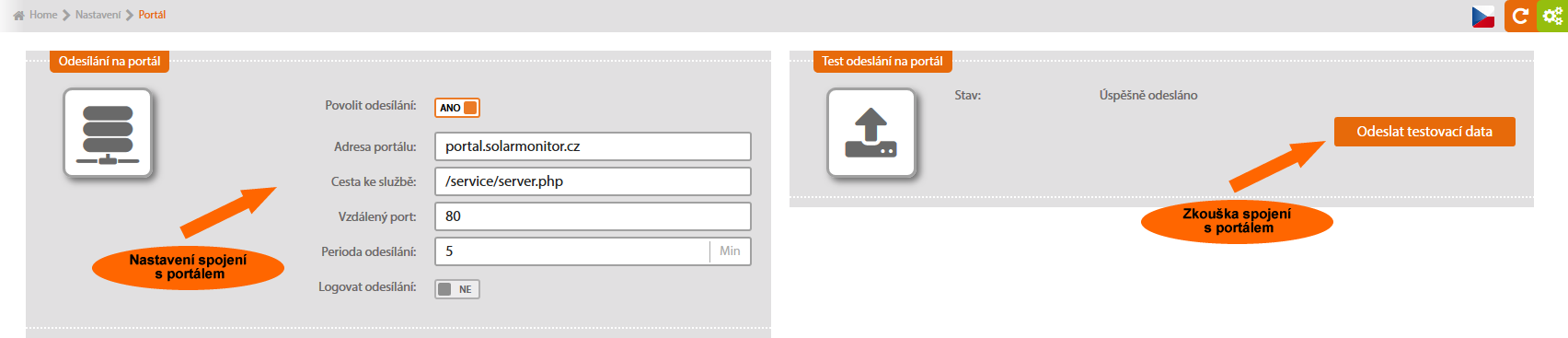 Na Portál odejde testovací zpráva a zobrazí se stav doručování. Pokud byla data úspěšně odeslána, vytvoří se na adrese http://portal.solarmonitor.cz nový účet, kde se data ukládají.