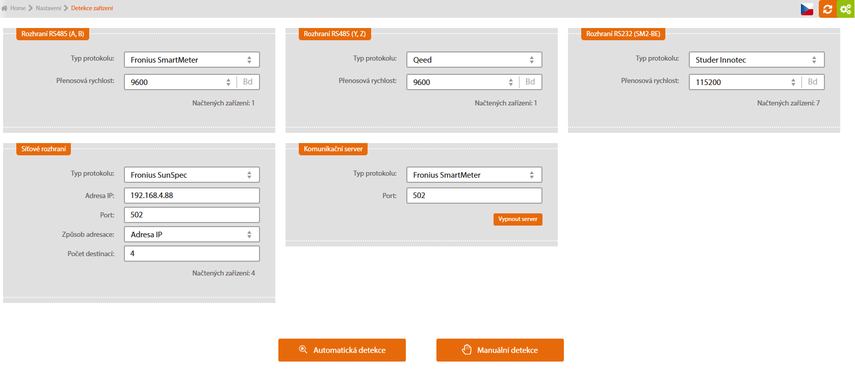 Podmenu detekce zařízení slouží k načtení připojených zařízení (střídačů, MPPT trackerů, měřidel) přes rozhraní RS485, RS232 a síťové rozhraní.