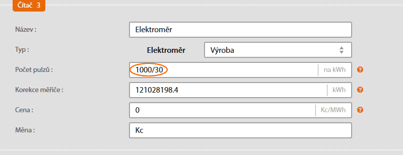 Podívejte se na transformátor nepřímého měření el. energie, který je připojen k elektroměru (ke každé fázi 1 transformátor), měl by na něm být uveden poměr (např. 150A/5A). Výsledek tohoto poměru (v tomto případě číslo 30) se dosaďte do vzorce např. 10000/30. Celý vzorec v této podobě (tedy 10000/30) vyplňte do pole počet pulzů.