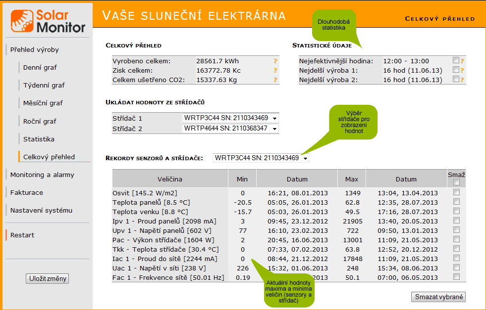 Rekordy senzorů a střídače