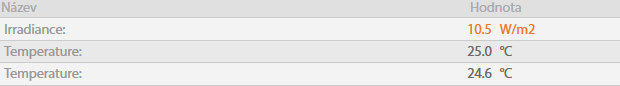 V tomto poli jsou vypsány všechny nalezené senzory a jejich aktuální hodnoty. Čtení senzorů se provádí každou vteřinu. Senzory je možno libovolně pojmenovat a nastavit jejich povolené hodnoty v menu Nastavení systému/Senzory a alarmy, viz kapitola Senzory a alarmy.