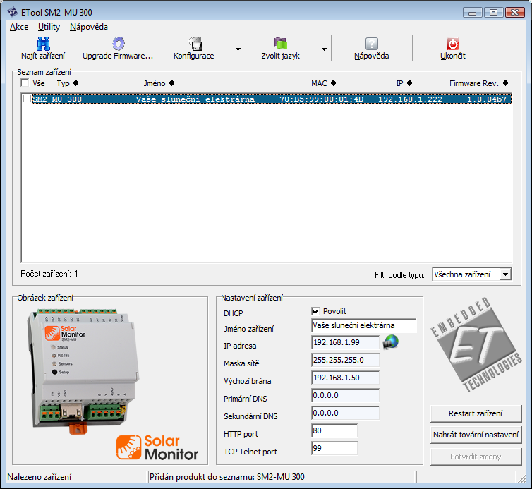 Program s názvem ETool umožňuje nalézt zařízení na síti, zařízení nakonfigurovat, nastavit defaultní hodnoty celého zařízení a restart zařízení.