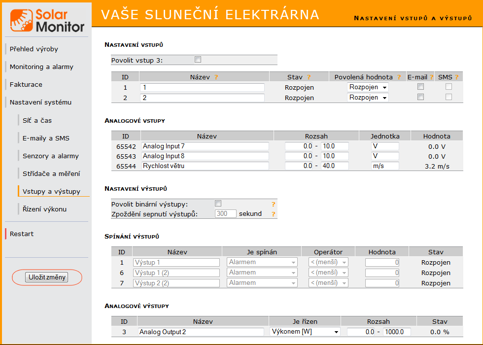 Jakmile jsou moduly spojeny a k Solar Monitoru je připojen napájecí zdroj, musí svítit zelená LED dioda Status. V opačném případě zkontrolujte spojení modulu s SM2-MU. V internetovém prohlížeči si otevřete menu „Nastavení systému / Vstupy a výstupy“.