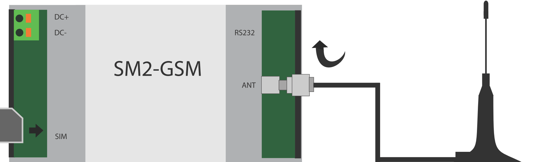 Připojte dodanou anténu s konektorem SMA k GSM modemu. Pak vložte SIM kartu dle nákresu. Na SIM kartě nesmí být nastaven PIN kód, to může provést například prostřednictvím mobilního telefonu.