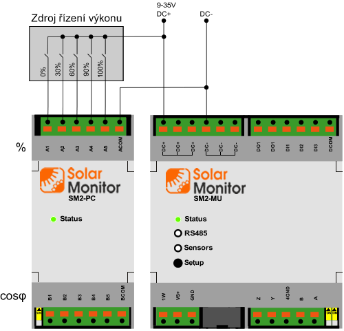 Pro správnou funkci řízení výkonu přivést do svorky ACOM a BCOM signál DC-. Ke zdroji řízení výkonu (zařízení operátora sítě) je třeba přivést signál DC+ na jeho společnou svorku. Signály pro řízení výkonu jsou pak přivedeny na svorky A1-A5 pro řízení činného výkonu v % a na svorky B1-B5 pro řízení jalového výkonu (cos φ). Následující obrázek znázorňuje příklad zapojení pro řízení činného výkonu v krocích 0 - 30 - 60 - 100%.