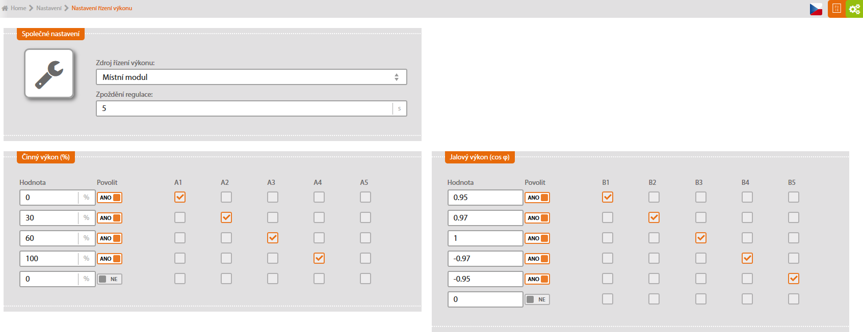 Jakmile jsou moduly spojeny a k Solar Monitoru je připojen napájecí zdroj, musí svítit zelená LED dioda status. V opačném případě zkontrolujte spojení modulu s SM2-MU. V internetovém prohlížeči si otevřete menu “Nastavení systému / Řízení výkonu”. Zde je třeba nastavit jednotlivé kombinace vstupů a jim odpovídající hodnoty řízení výkonu v %, případně hodnoty cos φ.