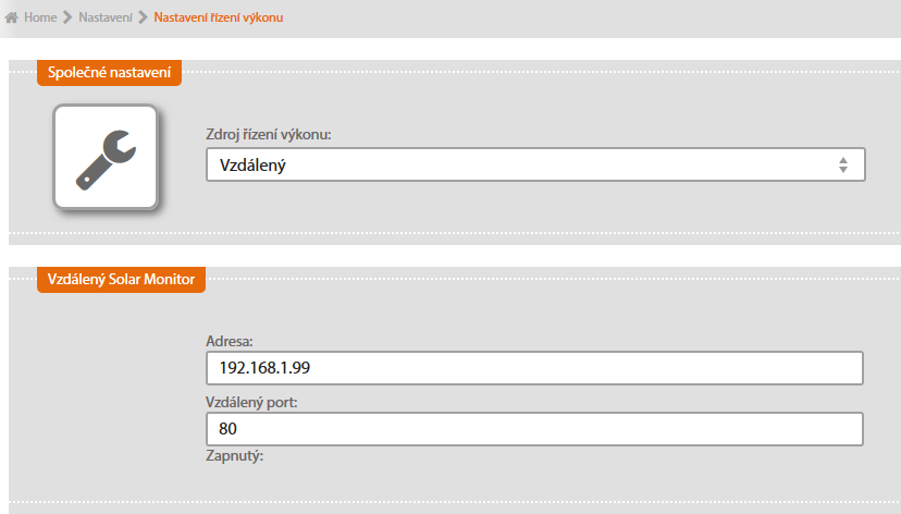 Chcete-li využít modul řízení výkonu pro více Solar Monitorů, zvolte u nich možnost “Vzdálený” v položce “Zdroj řízení výkonu”. Dále vyplňte adresu SM2-MU, k němuž je připojen modul řízení výkonu.