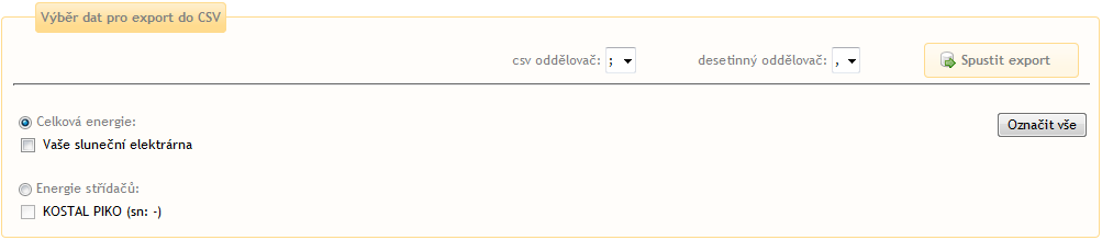 Vyberte jednotku (popř. jednotky) Solar Monitor pro export dat celkové vyrobené energie.