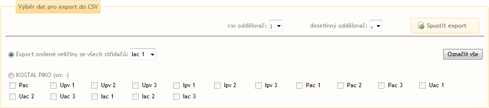 Export zvolené veličiny ze všech střídačů, Export zvolených veličin z vybraných střídačů
