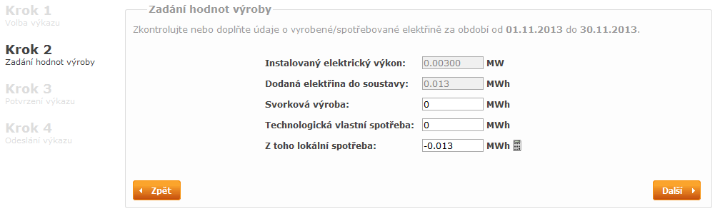 Pole Z toho lokální spotřeba se vyplní automaticky. Vypočítá se z hodnot v polích Svorková výroba, Elektřina dodaná do soustavy a Technologická vlastní spotřeba