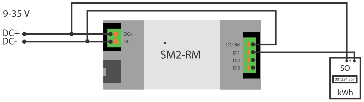 SM2-RM lze prostřednictvím binárních vstupů DI1, DI2 a DI3 připojit k elektroměru a dalším měřidlům (plynoměr, vodoměr), ze kterých poté vyčítá výrobu nebo spotřebu.