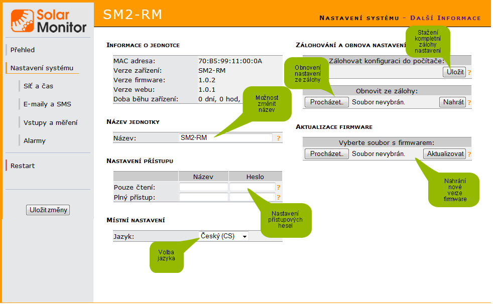 Toto menu slouží pro nahrání nové verze programového vybavení jednotky Solar Monitor. Pravidelně kontrolujte stránky www.solarmonitor.cz (v sekci Podpora/Ke stažení) pro stažení nejnovější verze firmware.